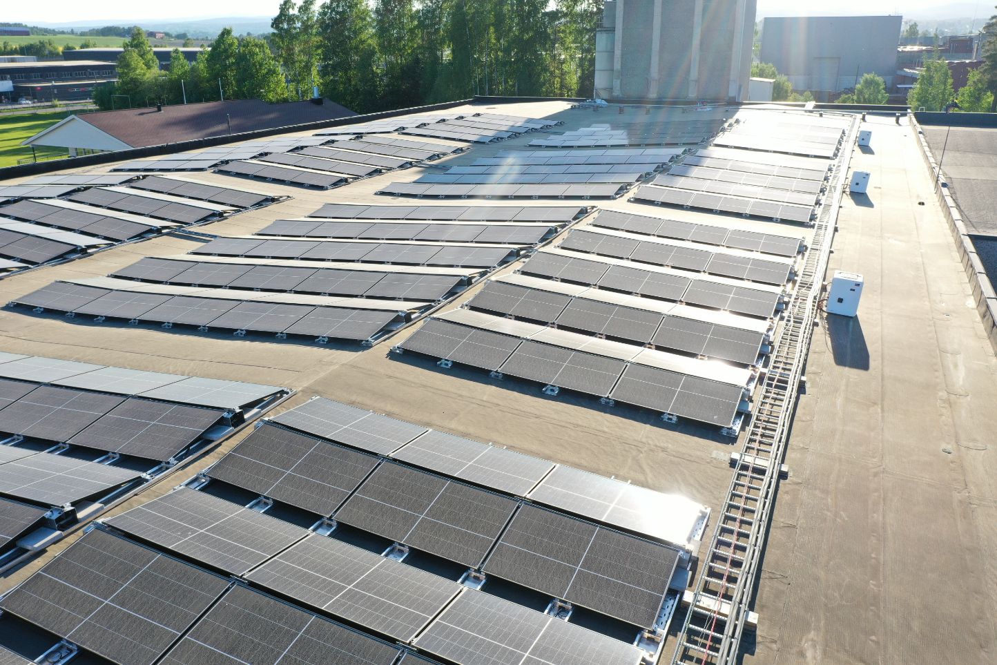 Yrkesbygg med store, flate tak har som regel ideelle forhold for solcelleanlegg som kan monteres uten å perforere taktekking. En balastert øst/vest konfigurasjon er den mest benyttede løsningen og gir best utnyttelsen av takarealet.